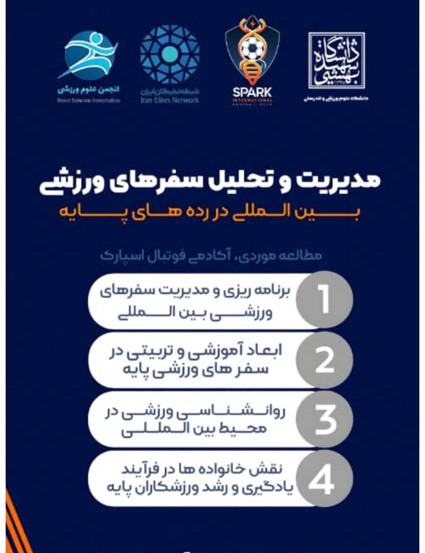 نشست تخصصی "مدیریت و تحلیل سفرهای ورزشی بین المللی در رده های پایه" با مطالعه موردی؛ آکادمی فوتبال اسپارک 19 آذر در آمفی تئاتر دانشکده برگزار می شود.