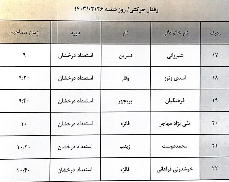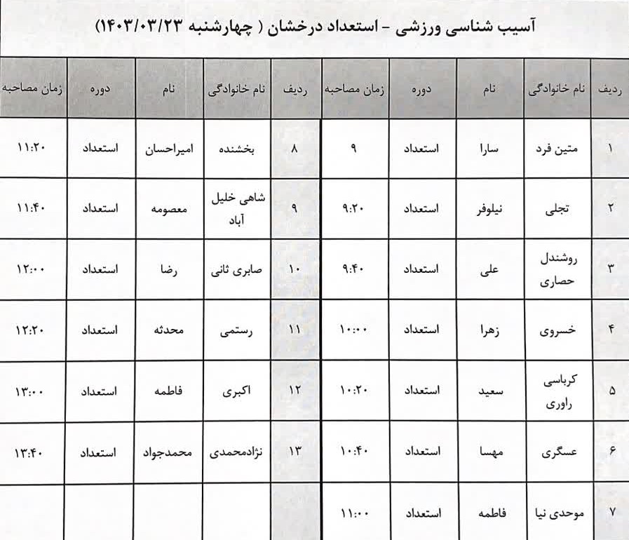 زمان بندی حضور متقاضیان رشته رفتارحرکتی (استعداد درخشان)- شنبه 26 خرداد​​​​​​​