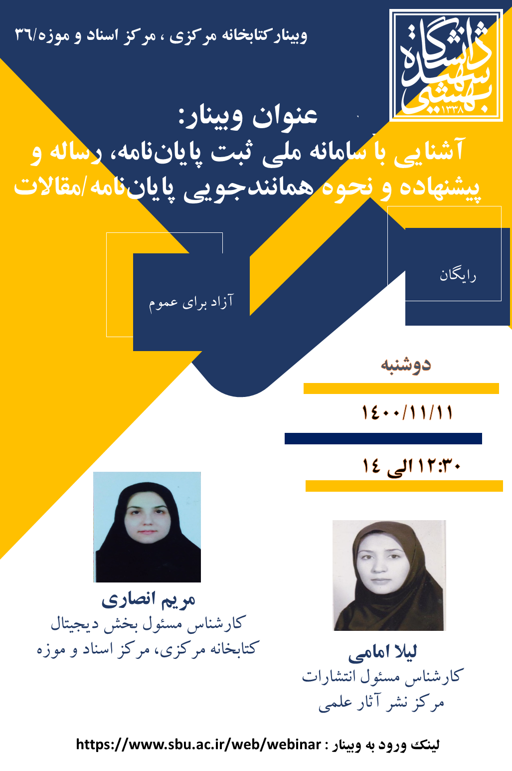 به اطلاع کاربران محترم کتابخانه مرکزی و مرکز اسناد دانشگاه شهید بهشتی میرساند، سی و ششمین وبینار آموزشی کتابخانه مرکزی با همکاری وبینار بهشتی تحت عنوان" آشنایی با سامانه ملی ثبت پایاننامه، رساله و پیشنهاده و همانندجویی پایاننامه/ مقالات " روز دوشنبه مورخ 11 دی ماه 1400 ساعت 12:30 با تدریس مریم انصاری، کارشناس مسئول بخش دیجیتال کتابخانه مرکزی، مرکز اسناد و موزه و لیلا امامی، کارشناس مسئول مجلات علمی مرکز نشر آثار علمی دانشگاه به صورت مجازی از طریق لینک برگزار میشود.