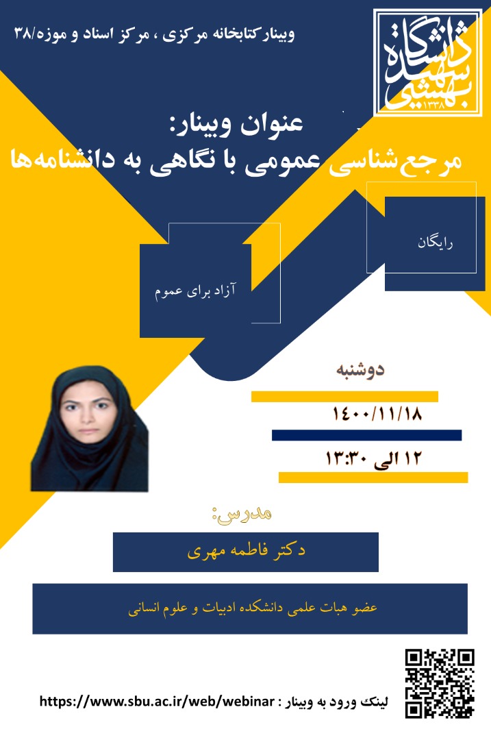 به اطلاع کاربران محترم کتابخانه مرکزی و مرکز اسناد دانشگاه شهید بهشتی میرساند، سی و هفتمین وبینار آموزشی کتابخانه مرکزی با همکاری وبینار بهشتی تحت عنوان" مرجعشناسی عمومی با نگاهی به دانشنامهها" روز دوشنبه مورخ 18 بهمنماه 1400 ساعت 12 با تدریس دکتر فاطمه مهری، عضو هیات علمی دانشکده ادبیات و علوم انسانی دانشگاه شهید بهشتی به صورت مجازی از طریق لینک برگزار میشود.